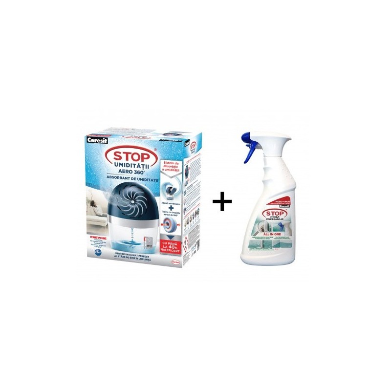 CADOU: 1 REZERVA ABSORBANT STOP UMIDITATE AERO 360Ceresit AERO 360°, noul sistem de absorbtie a umiditati ofera o circulatie a aerului de 360°. Ofera o absorbtie ridicata a umiditatii din aer si neutralizeaza eficient mirosurile neplacute, stabilind noi standarde. Acum pentru incaperi mari de pana la 50m3 si pentru medii cu umiditate extrema.