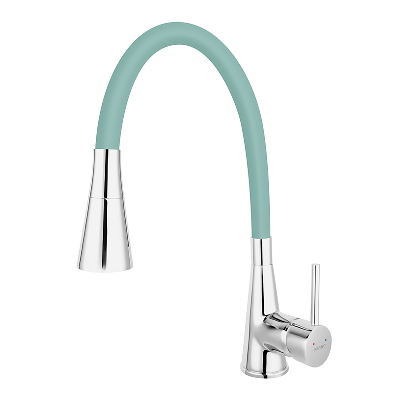 Bateria de bucătărie Zumba cu pipă flexibilă de culoare mentă este un accesoriu practic și atractiv pentru bucătăria dvs. Bateria are un design contemporan și elegant, cu o pipă flexibilă, care permite o manevrabilitate ușoară și ajustarea direcției apei. Culoarea menta adăuga o notă de prospețime și stil în bucătărie.