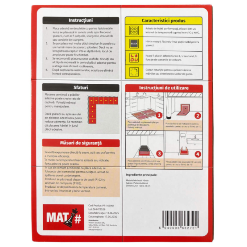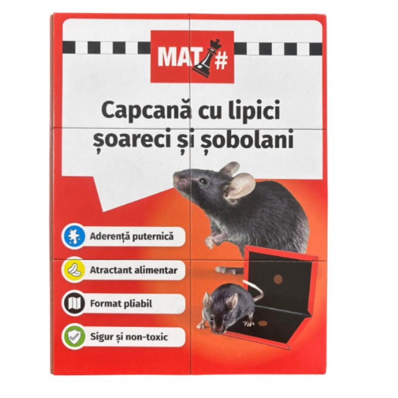 Capcana cu lipici tip carte pentru șoareci și șobolani MAT este o soluție eficientă și sigură pentru combaterea rozătoarelor, având un design pliabil care facilitează utilizarea și depozitarea.