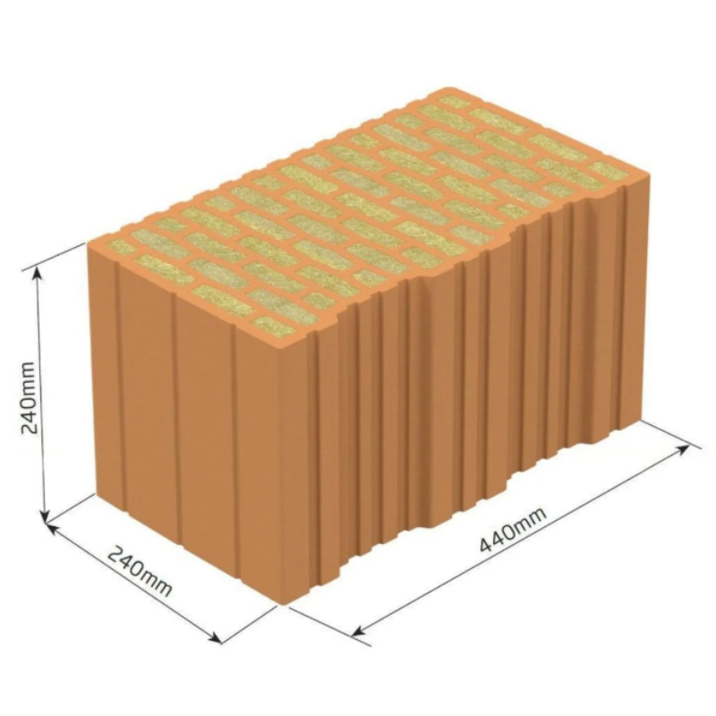 Caramida exterior, cu vata bazaltica, Cemacon Evoceramic 44 VB, cu dimensiunile 240 x 440 x 240 mm, este un bloc ceramic portant cu vata bazaltica integrata Astfel, cu EVOCERAMIC VB se pot construi case in stil traditional cu pereti cu grosimea de 44 cm, fara a fi necesara realizarea structurii principale portante pe cadre.