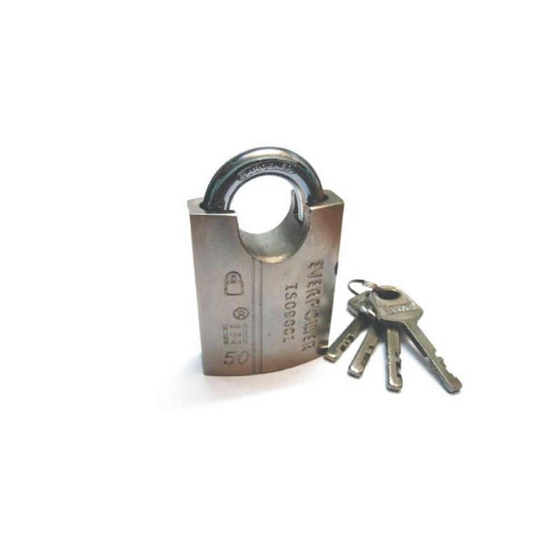 Lacatul prezinta: corp din alama solida, veriga din otel cromat, inchidere dintr-o miscare, deschidere pe baza de cheie.