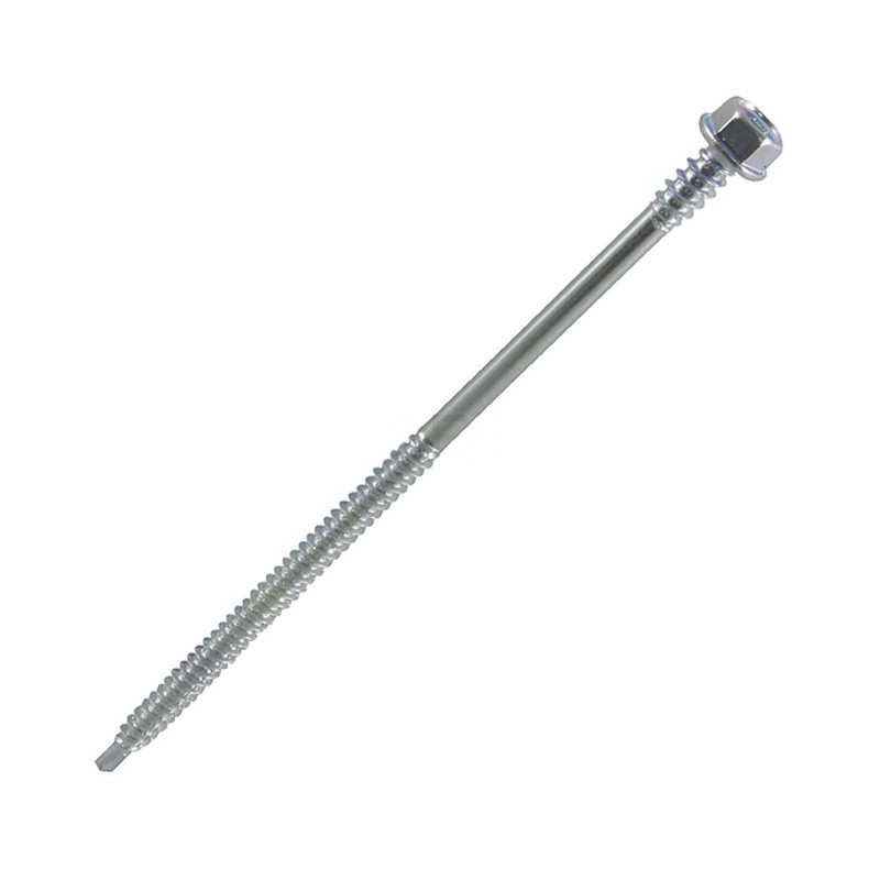 Surub autoforant realizat din otel zincat alb, cu cap hexagonal, filetat partial, recomandat pentru fixarea panourilor pe structuri din tabla.