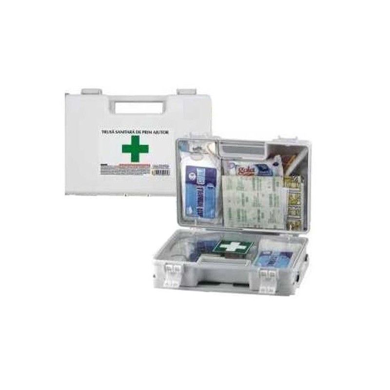Contine: alcool sanitar, alcool iodat, rivanol solutie, perogen, fese tifon, leucoplast, plasture, vata hidrofila, compresa sterila, pansamente cu rivanol, foarfece varf bont, pipe; Guedel, deschizator de gura, garou elastic, atele, bandaj triunghiular, manusi de examinare, ace siguranta, pahar de unica folosinta.