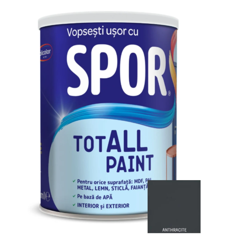 Spor Totall Paint este o vopsea pe baza de apa, de inalta calitate, cu finisaj satinat, potrivita pentru interior / exterior. Aceasta este ideala pentru reconditionarea mobilei de bucatarie, pentru dulapuri, usi, rame geamuri si se poate poate aplica pe: lemn, metal, PVC, MOD, PAL, faianta, pereti, sticla, caramida etc.